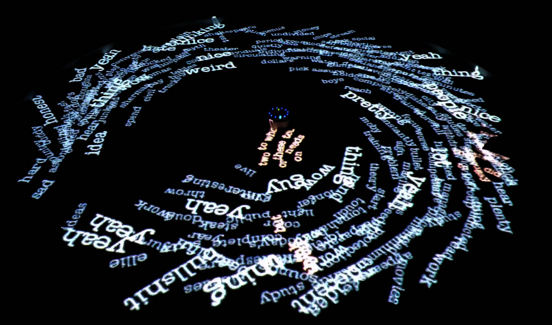 2020-2021. This installation invites people to chat over a table. The words, freed from the speakers, begin a life of their own.